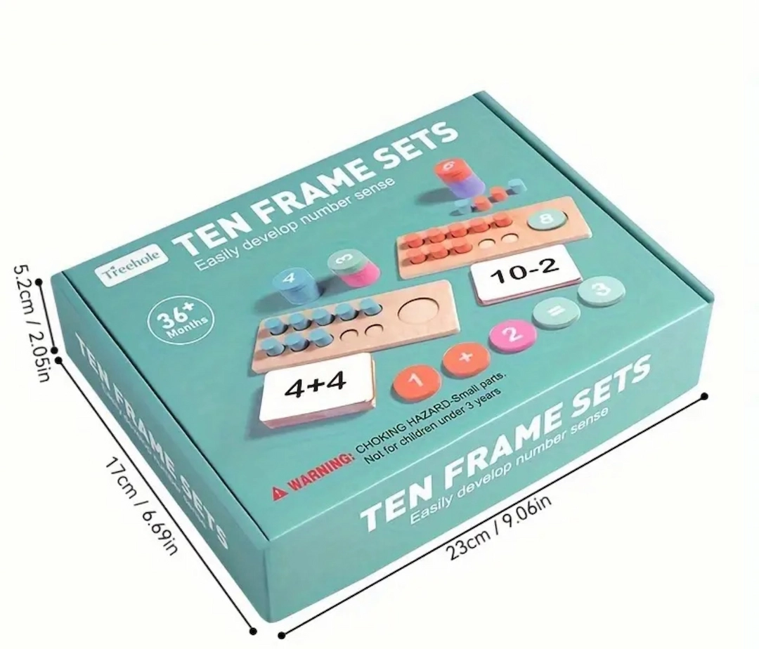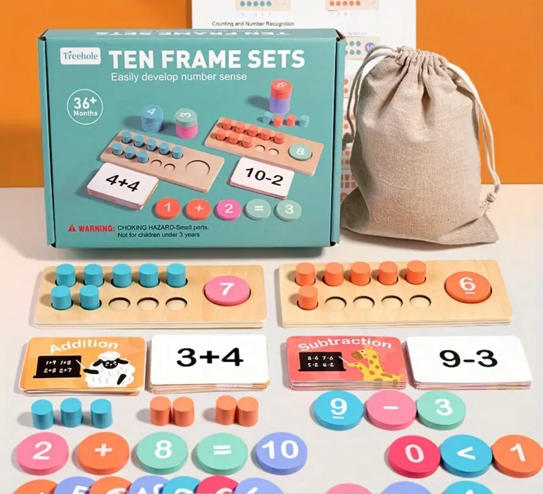 Este set de marcos de diez ayuda a los niños a comprender operaciones básicas como suma y resta utilizando fichas de colores y tarjetas con ejercicios. Su diseño en madera lo hace resistente, seguro y atractivo para actividades de aprendizaje en casa o en el aula.